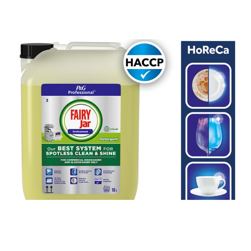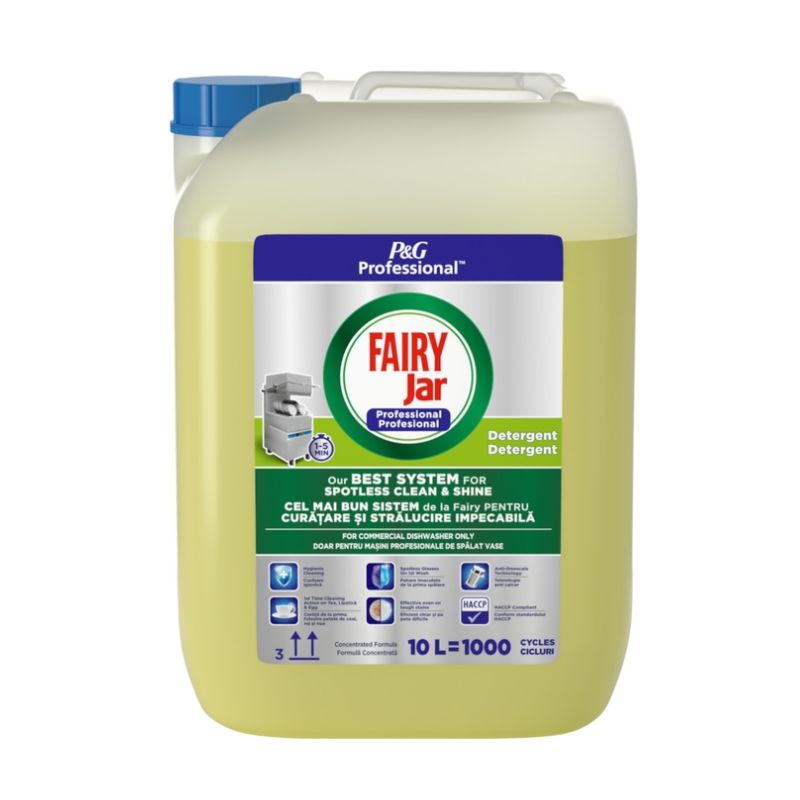 Fairy Professional to skoncentrowany detergent w płynie, przeznaczony do zmywarek komercyjnych o krótkim cyklu pracy (1–5 min.). Zawiera specjalną formułę zapewniającą doskonałe mycie oraz zapobiegającą osadzaniu się kamienia. Wiodąca formuła zapewniająca nieskazitelną czystość i blask. Skuteczny nawet w przypadku najbardziej uporczywych plam. Zgodny z HACCP, przeznaczony do profesjonalnych kuchni. Doskonałe efekty czyszczenia już za 1. razem w przypadku plam po herbacie, szmince i jajkach.