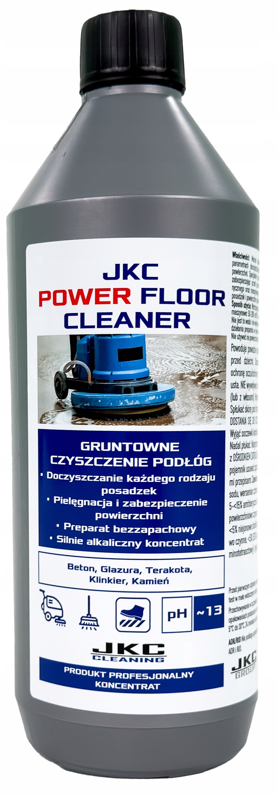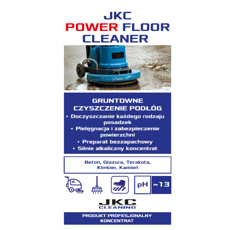 JKC POWER FLOOR CLEANER to skoncentrowany, biodegradowalny i niskopieniący preparat do gruntownego mycia mocno zabrudzonych posadzek. Idealny do usuwania tłustych plam, zabrudzeń użytkowych oraz pozostałości po innych środkach czyszczących — szybki, skuteczny i bezwonny, co sprawia, że świetnie nadaje się do codziennego użytku w obiektach o dużym natężeniu ruchu.