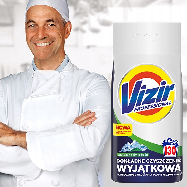 Vizir Professional proszek do prania białychy i jasnych tkanin, detergent piorący Alpine firmy PG Professional, 130 prań, 7.15kg – Olśniewająca biel nawet po wielu praniach.